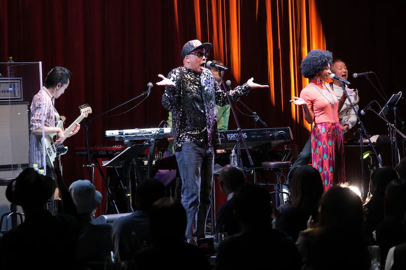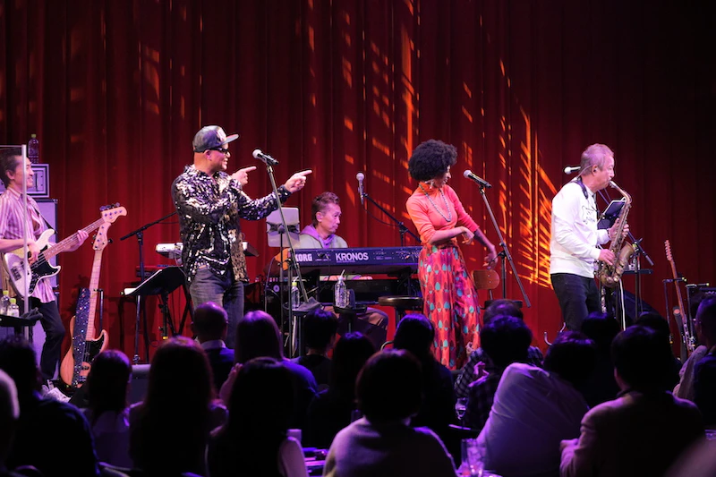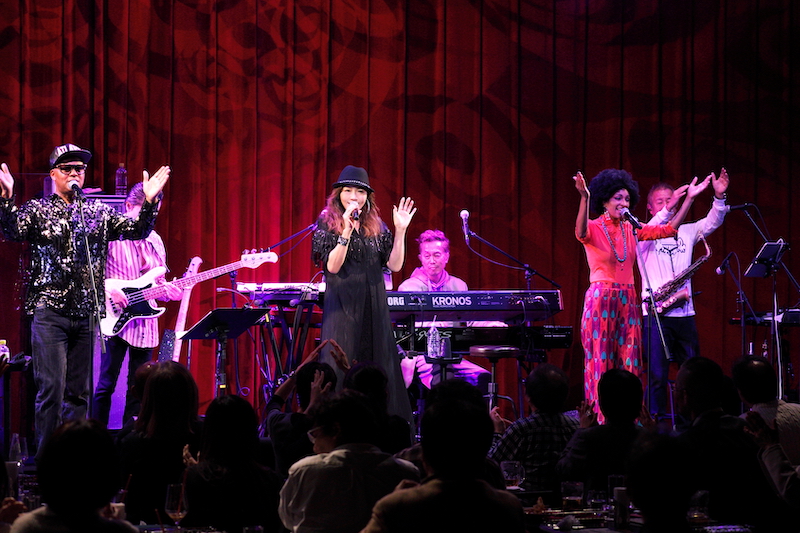 中盤にはChloeとGary Adkinsにメインボーカルを託して聴かせた。ChloeはTAKE6のマーク・キブルの娘さんで、杏里の影響をたくさん受けているそう。この日は自身のフェイバリットソングとして杏里の「summer candles」のカバーを披露した。繊細さも兼ね備えたハリのあるパワフルなボーカルは、まさしくサラブレッド。このメンツをバックに、堂々とした歌声を響かせて会場を圧倒した。続いてGary Adkinsはテンプテーションズの「get ready」をカバー。打ち鳴らされたドラムとともに一転ノリのいいサウンドが会場を包み込むと、観客は一斉に立ち上がってクラップしながら歓声をあげた。