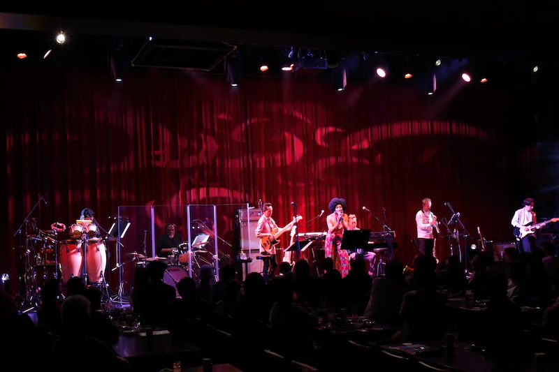 落ち着いた大人のムード漂う会場。温かい拍手に迎えられてメンバーがステージに現れる。1曲目の「Yah-Mo」は、キーボード/バンマスの小倉泰治によるオリジナル曲で、ダニー・ハサウェイなどをリスペクトしてこの日のために作った新曲とのこと。グルーヴ感あふれる演奏に手拍子が重なり、次々と繰り出される各楽器のソロパートには、その都度歓声が上がった。「ウェルカム!」という挨拶をボコーダーで発するなど、冒頭から遊び心たっぷりだ。続いてマーヴィン・ゲイのカバー「Inner city blues」を繰り出す。ベースの小松秀行とパーカッションの斉藤ノヴが繰り出すジャジーなリフに乗せて、サックスの鈴木明男が艶めかしくメロディーを奏で、植田浩二がエモーショナルにギターをプレイ。そんな演奏に拍手と歓声が沸き起こると、「今日は我々の初公演にお越しくださってありがとうございます。最後まで楽しんでください」と、小倉が挨拶をして歓声に返した。
